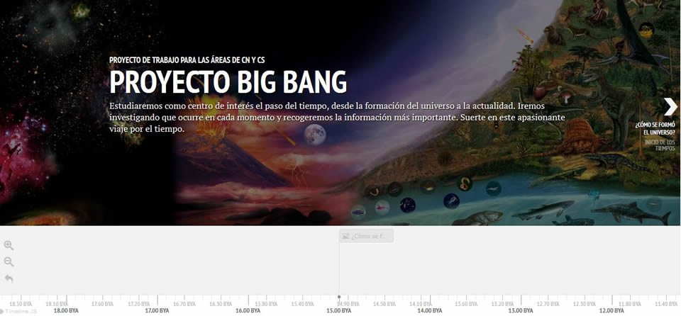 | Trabajo conjunto de las áreas de Ciencias Naturales y Ciencias Sociales mediante proyectos. Se pretende que los grupos de cada localidad, formados por diferentes cursos y todas las unidades de nuestro CRA, trabajen en el mismo proyecto con un eje vertebrador o centro de interés que es, el paso del tiempo. Desde la formación del universo a la actualidad, iremos investigando y aprendiendo que ocurre en cada momento y recogeremos la información más importante, la desarrollaremos, la procesaremos y la compartiremos, gracias al trabajo cooperativo de cada aula y de todas las de nuestro CRA. |